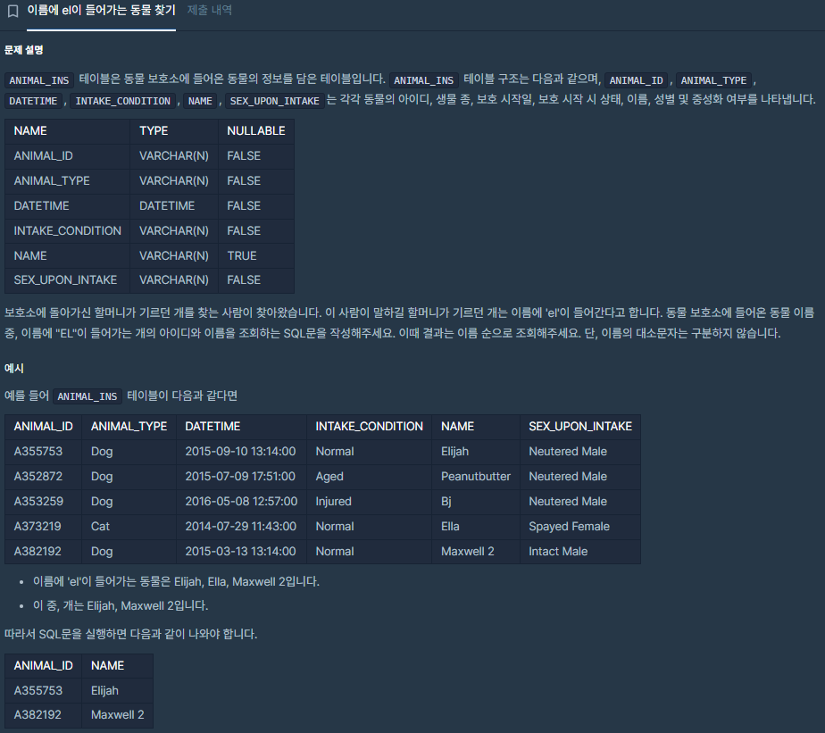 이름에 el이 들어간 동물을 조회하기 위해 NAME like '%el%' 조건 추가.
