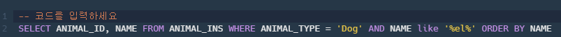 이름에 el이 들어간 동물을 조회하기 위해 NAME like '%el%' 조건 추가.