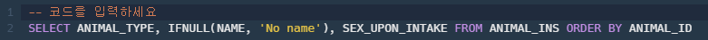 IFNULL(NAME, 'No name')을 통해 NAME 컬럼의 값이 NULL일 경우 'No name'으로 대체 후 ANIMAL_ID 기준 오름차순 정렬.
