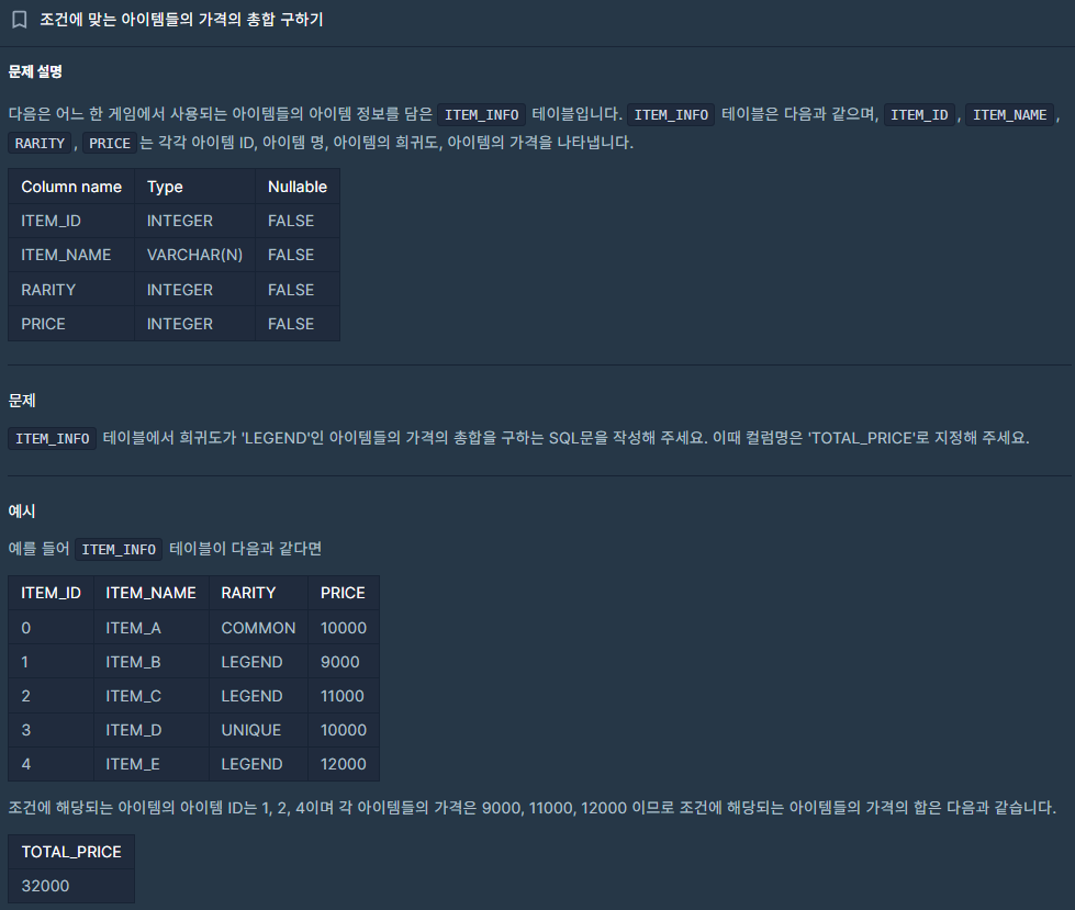 SUM 메소드를 사용해 legned가 포함된 모든 컬럼의 PRICE값을 더해 총합을 구함.