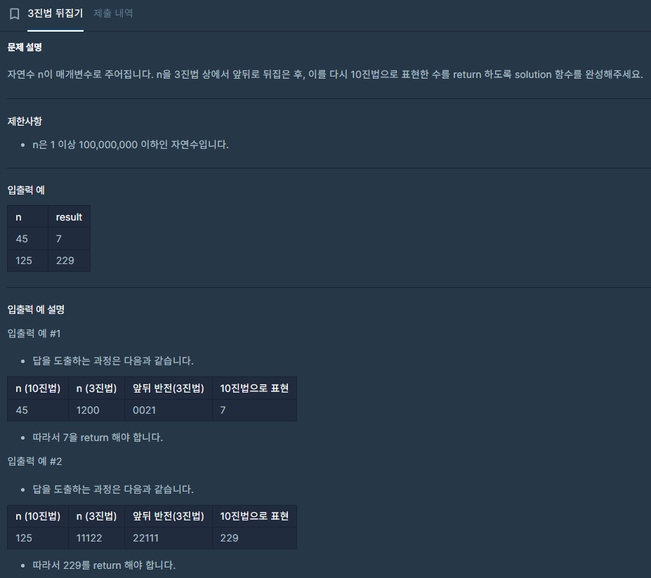 // 뒤집은 3진법 숫자를 원하니 three 뒤에 n % 3의 결과를 이어 붙여서 뒤집는 과정을 생략한다.