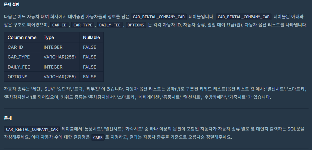 2) 아래 메인 쿼리문에서 CAR_TYPE별로 그룹화 및 오름차순 정렬.