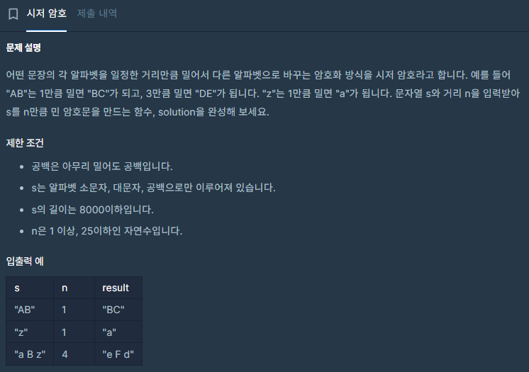 1) 현재 문자에서 n만큼 이동한 값의 값이 소문자의 경우 'z' 보다, 대문자의 경우 'Z' 보다 큰경우를 고려한다.